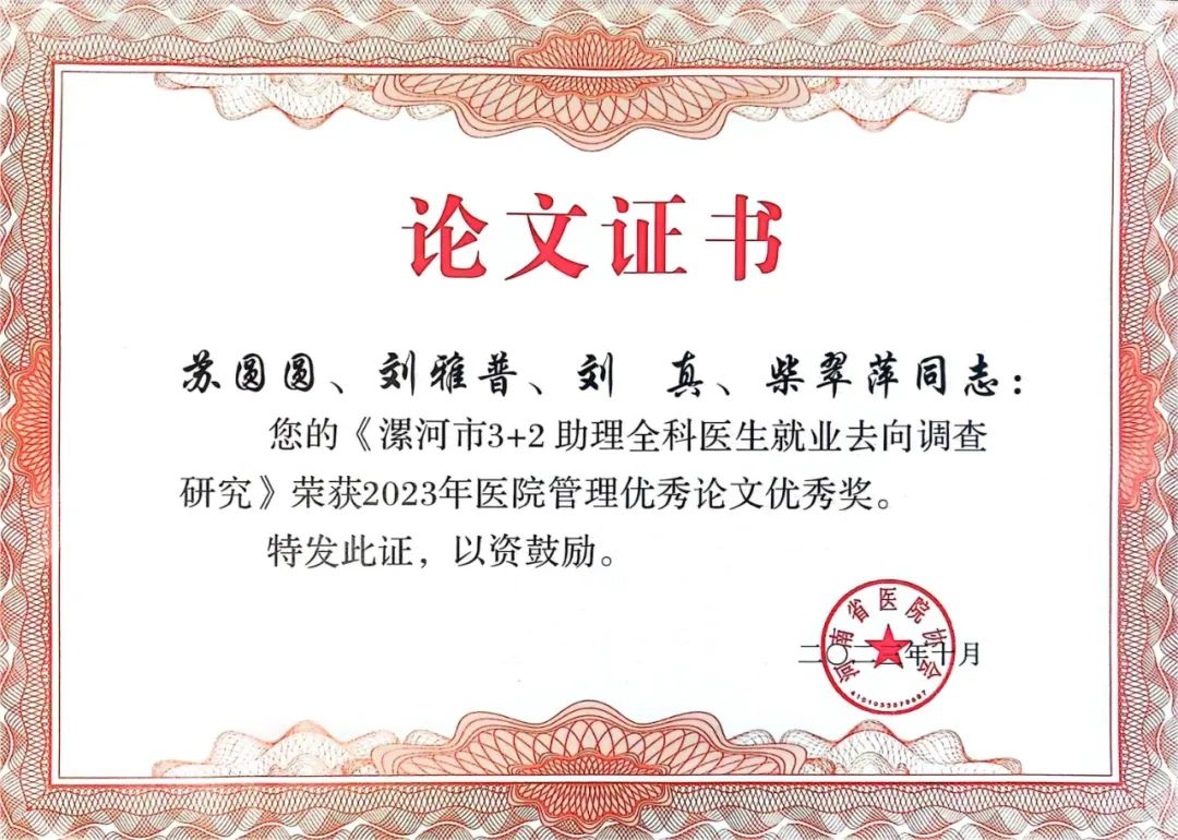 由蘇圓圓、劉雅普、劉真、柴翠萍共同完成的《漯河市3+2助理全科醫(yī)生就業(yè)去向調(diào)查研究》被授予2023年醫(yī)院管理優(yōu)秀論文優(yōu)秀獎(jiǎng)。