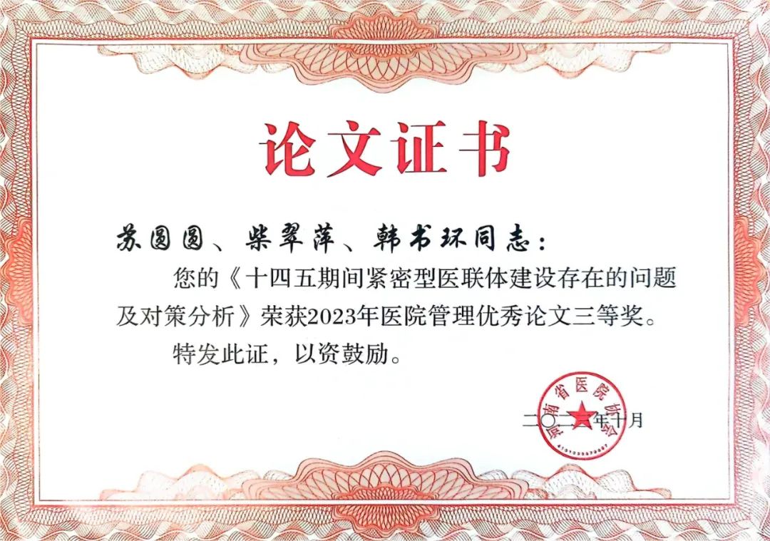 由蘇圓圓、柴翠萍、韓書環(huán)共同完成的《十四五期間緊密型醫(yī)聯(lián)體建設(shè)存在的問(wèn)題及對(duì)策研究》被授予2023年醫(yī)院管理優(yōu)秀論文三等獎(jiǎng)。