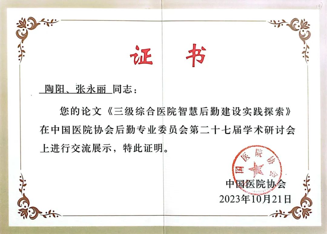 醫(yī)院總務(wù)科陶陽(yáng)、張永麗共同完成的《三級(jí)綜合醫(yī)院智慧后勤建設(shè)實(shí)踐探索》論文被河南省醫(yī)院協(xié)會(huì)授予2023年醫(yī)院管理優(yōu)秀論文二等獎(jiǎng),被第11屆中南六?。▍^(qū))醫(yī)院院長(zhǎng)高峰論壇組委會(huì)及河南省醫(yī)院協(xié)會(huì)共同授予優(yōu)秀論文三等獎(jiǎng)。以及《運(yùn)用RCA(根因分析法)對(duì)醫(yī)院建筑屋面雨水倒灌事件進(jìn)行原因分析和對(duì)策》被授予2023年醫(yī)院管理優(yōu)秀論文二等獎(jiǎng),進(jìn)一步被推送到中國(guó)醫(yī)院協(xié)會(huì)后勤專業(yè)委員會(huì)第二十七屆學(xué)術(shù)研討會(huì)上進(jìn)行學(xué)術(shù)交流。