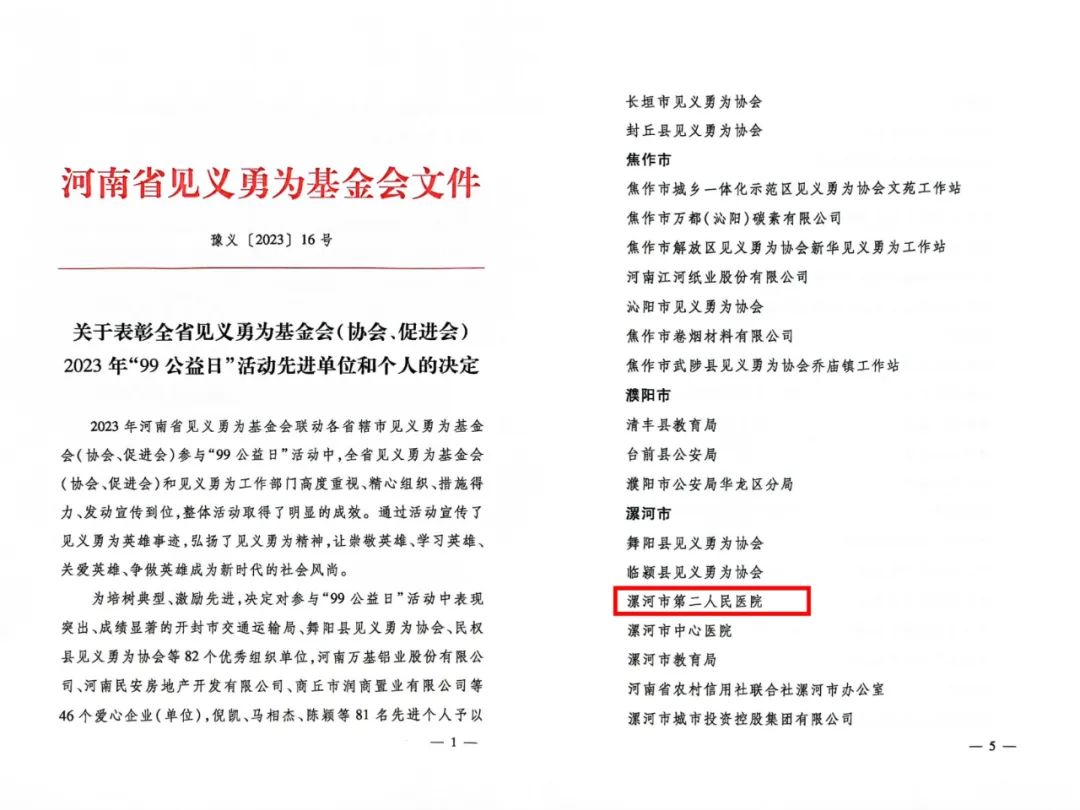 近日,市二院被河南省見(jiàn)義勇為基金會(huì)授予全省2023年“99公益日”活動(dòng)先進(jìn)單位榮譽(yù)稱(chēng)號(hào)。