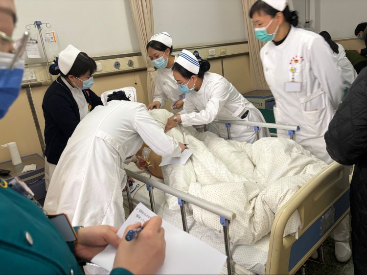 了解患者基本情況后,王爽一行來到病房,責(zé)任護(hù)士對(duì)患者進(jìn)行了詳細(xì)的體格檢查。大家對(duì)患者進(jìn)行溫情溝通,評(píng)估患者的飲食、疼痛度,查看患者情況及各項(xiàng)護(hù)理措施落實(shí)情況,對(duì)存在的疑難問題進(jìn)行了現(xiàn)場指導(dǎo)。