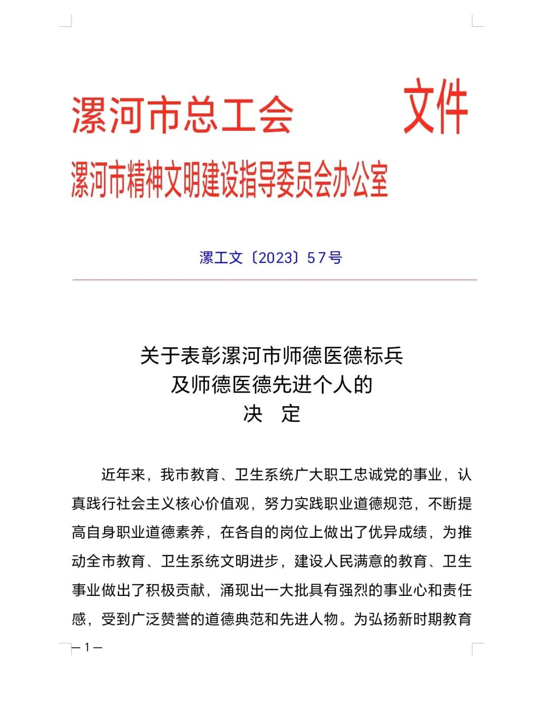 近日,漯河市總工會、漯河市精神文明建設(shè)指導(dǎo)委員會辦公室聯(lián)合發(fā)文《關(guān)于表彰漯河市師德醫(yī)德標(biāo)兵及師德醫(yī)德先進(jìn)個人的決定》,市二院放療科主任趙亮榮獲“漯河市醫(yī)德標(biāo)兵先進(jìn)個人”榮譽(yù)稱號。