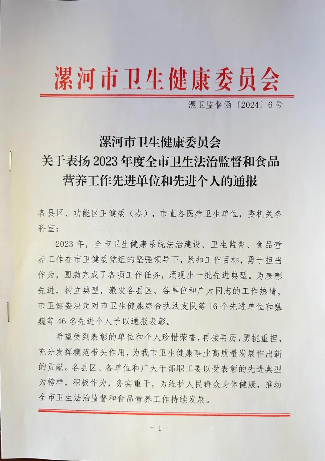 在3月20日召開的2024年度全市疾病預(yù)防控制、衛(wèi)生法治監(jiān)督暨食品營養(yǎng)工作會(huì)議上,市二院榮獲2023年度全市法治醫(yī)院建設(shè)工作先進(jìn)單位,陳誠榮獲全市法治醫(yī)院建設(shè)工作先進(jìn)個(gè)人。