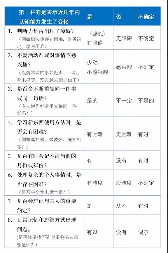 目前比較常用的是AD8癡呆篩查量表,它通過8個簡單的問題,快速評估是否有阿爾茨海默病風(fēng)險。如果出現(xiàn)2個及以上的表現(xiàn),則要及時到醫(yī)院就診咨詢,進一步明確診斷。 (殷旭芳)