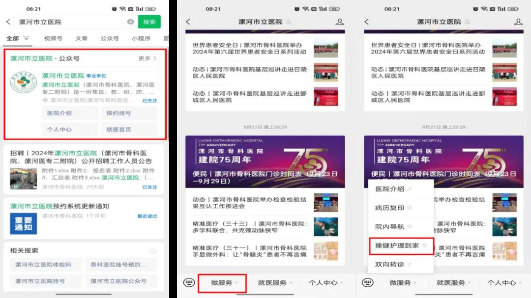 1.微信公眾號搜索“漯河市立醫(yī)院”,進(jìn)入公眾號點擊“微服務(wù)”,選擇“豫健護(hù)理到家”。