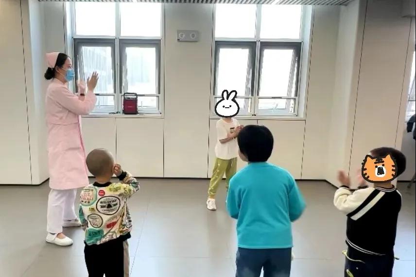 每天固定的時(shí)間和地點(diǎn)組織患兒與患兒家屬在七樓大廳做親子小律動(dòng)操,聽(tīng)音樂(lè)做運(yùn)動(dòng),不僅可以鍛煉孩子的粗大運(yùn)動(dòng)的協(xié)調(diào)性;改善孩子們的溝通能力和集體活動(dòng)的參與性;歡快的音樂(lè)可以刺激神經(jīng)系統(tǒng)的興奮性,抑制低落情緒,緩解緊張、焦慮,有助于穩(wěn)定患兒情緒,促進(jìn)患兒身心康復(fù)。