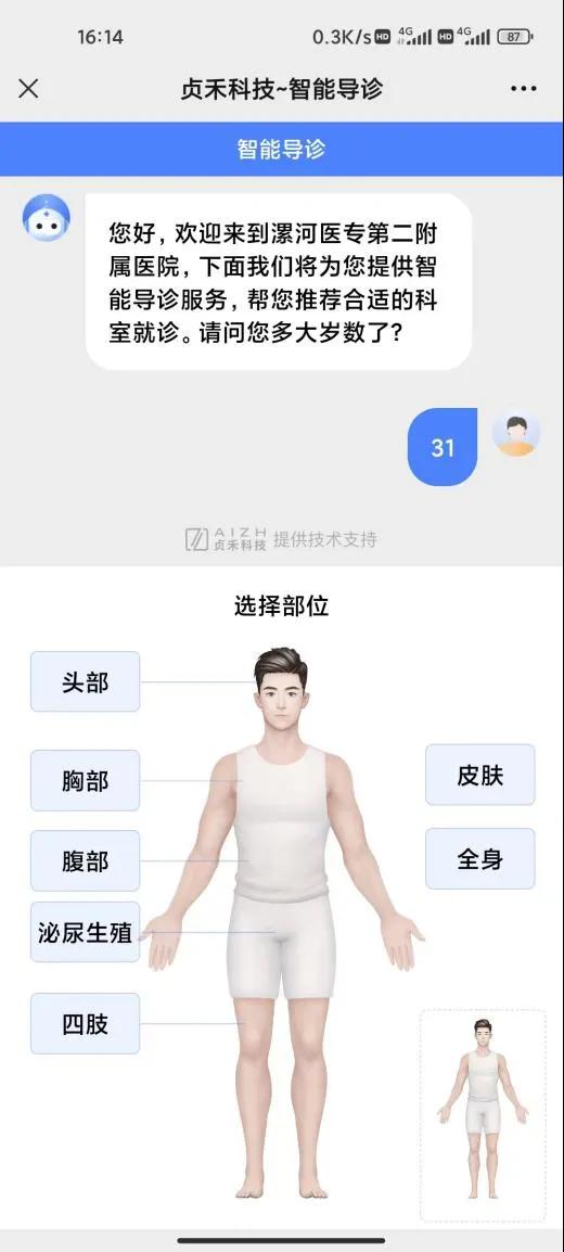 02、點(diǎn)擊就醫(yī)服務(wù),選擇智能導(dǎo)診,進(jìn)入人機(jī)交互界面。