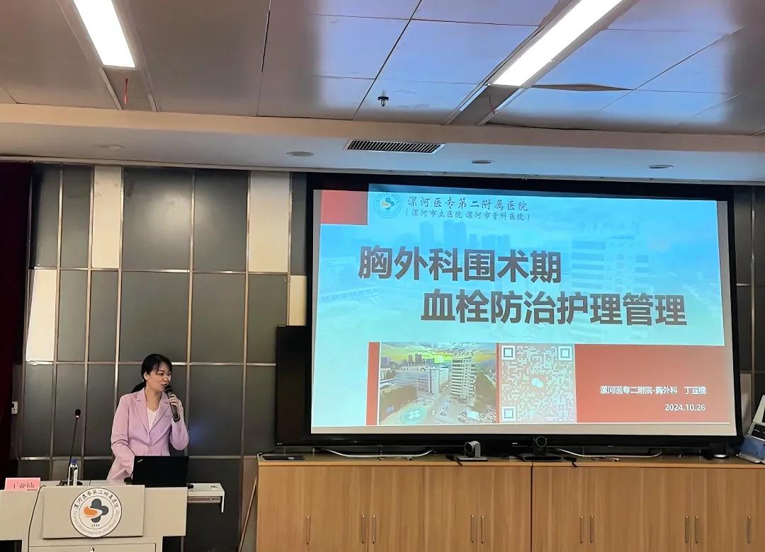 丁亞楠護士長以《胸外科圍術期血栓防治護理管理》為題,講述胸外科血栓防治護理管理是確?;颊邍g期安全的重要環(huán)節(jié),需要貫穿患者術前、術中、術后及出院后的全過程,通過全面的評估、個性化的預防措施、密切的病情觀察和有效的抗凝治療手段,降低血栓形成的風險,確?;颊叩陌踩?。醫(yī)護不分家,醫(yī)療團隊及護理團隊的共同發(fā)展才能促進??平ㄔO的發(fā)展,丁亞楠護士長促使胸外護理團隊的??平ㄔO,對VTE的防治管理規(guī)范管理,為胸外的發(fā)展提供助力。