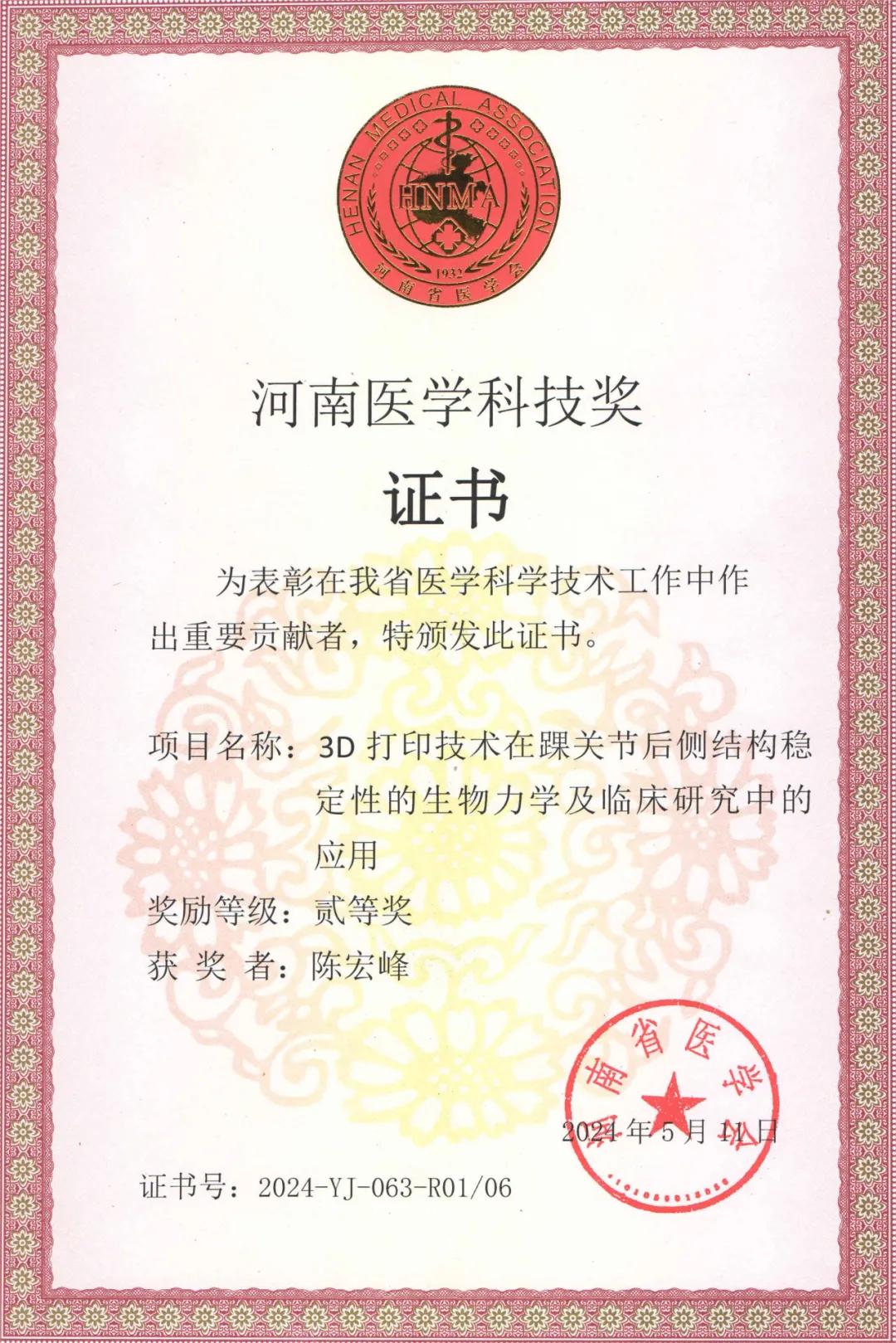 在陳宏峰主任帶領(lǐng)下,2012年起,在豫中南地區(qū)率先開展踇外翻、平足癥、高弓足畸形的規(guī)范化矯治。2012年完成豫中南第一例自體韌帶重建治療踝關(guān)節(jié)外側(cè)韌帶陳舊性損傷,2019年完成豫中南第一例踝上截骨術(shù)(SMO)治療踝關(guān)節(jié)骨性關(guān)節(jié)炎,2020年完成豫中南第一例軟骨移植術(shù)(AOT)治療距骨軟骨損傷。2021年完成豫中南第一例人工全踝關(guān)節(jié)置換術(shù)治療終末期踝關(guān)節(jié)骨性關(guān)節(jié)炎,2024年開展人工跖趾關(guān)節(jié)置換治療踇外翻、類風(fēng)濕關(guān)節(jié)炎足,相繼開展了脛骨橫向骨搬運(yùn)術(shù)治療糖尿病足,應(yīng)用骨科手術(shù)機(jī)器人結(jié)合髓內(nèi)釘微創(chuàng)治療踝關(guān)節(jié)骨折、跟骨骨折,踝關(guān)節(jié)鏡下微創(chuàng)修復(fù)踝關(guān)節(jié)外側(cè)韌帶損傷等領(lǐng)先技術(shù),在豫中南地區(qū)享有盛譽(yù)。