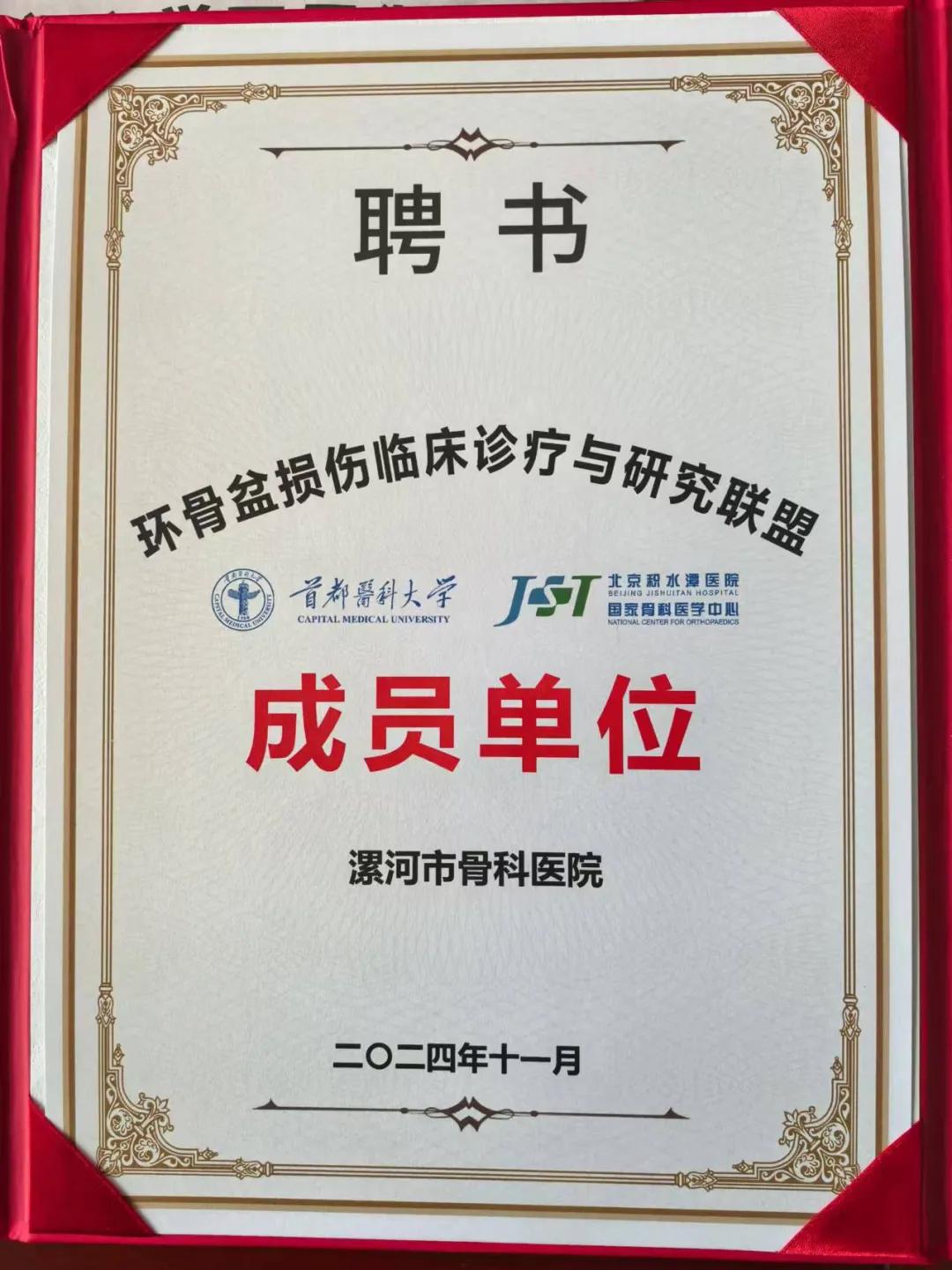 近日,北京積水潭醫(yī)院(國家骨科醫(yī)學(xué)中心)骨科??坡?lián)盟——環(huán)骨盆損傷臨床診療與研究分聯(lián)盟成立大會在北京舉行。漯河市骨科醫(yī)院(漯河醫(yī)專二附院、漯河市立醫(yī)院)作為首批成員單位應(yīng)邀參加此次大會。