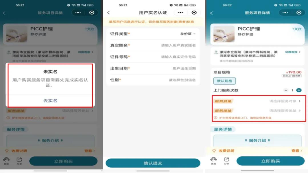 3.購買之后需實(shí)名認(rèn)證,請正確填寫各項(xiàng)信息,服務(wù)對象填寫的是需要被護(hù)理的患者,地址填寫準(zhǔn)確。