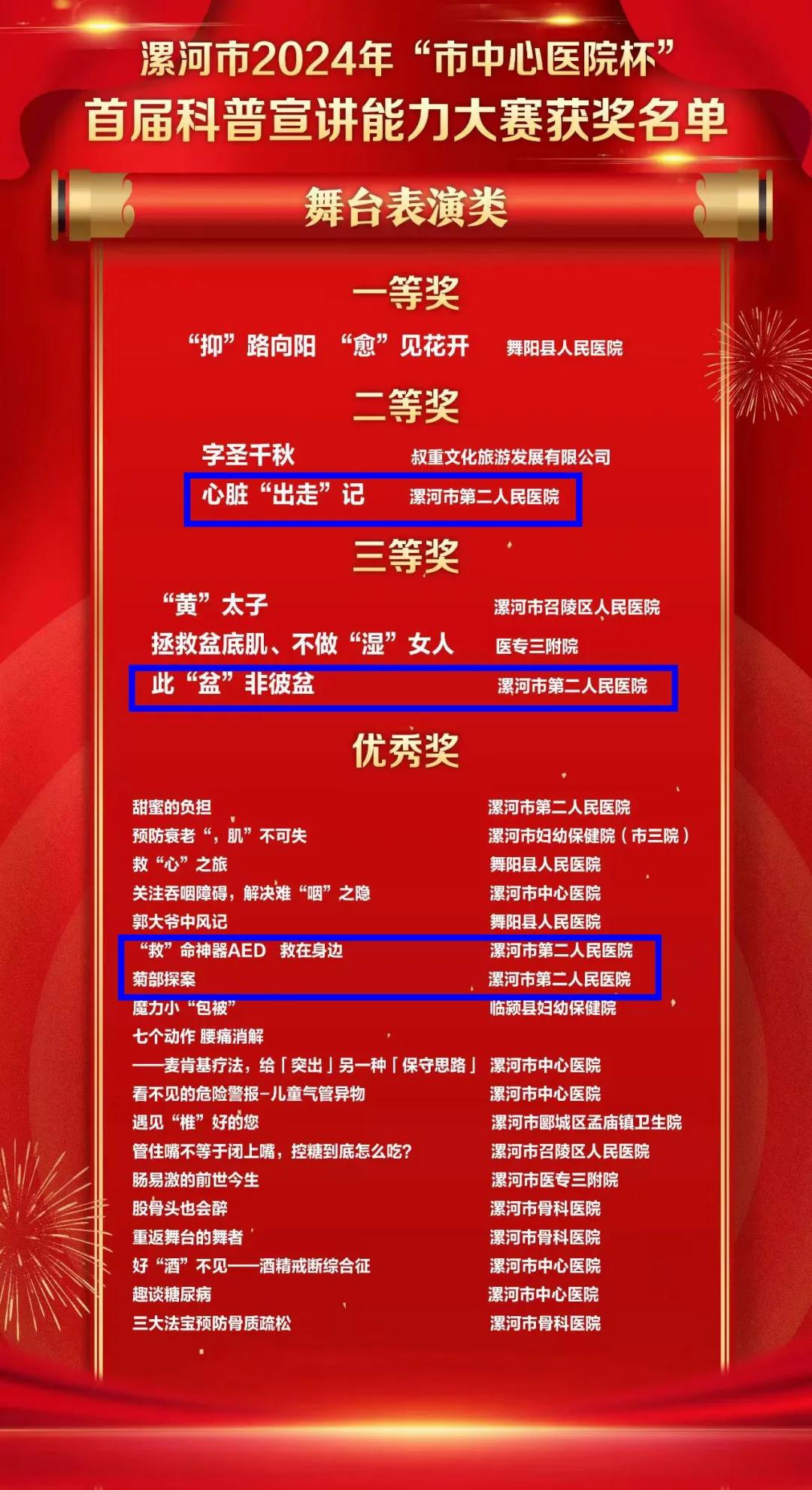 12月18日,由中共漯河市委宣傳部、中共漯河市委人才工作領(lǐng)導(dǎo)小組辦公室、漯河市科學(xué)技術(shù)協(xié)會(huì)、漯河市衛(wèi)生健康委員會(huì)聯(lián)合主辦,漯河市中心醫(yī)院冠名,漯河日?qǐng)?bào)社承辦的漯河市2024年“市中心醫(yī)院杯”首屆科普宣講能力大賽決賽落下帷幕。經(jīng)過激烈角逐,市二院精心選送的參賽作品由劉橋、李媛、安自譚、袁泉、任崢崢出演的《心臟“出走”記》榮獲舞臺(tái)表演類二等獎(jiǎng);由井紅鴿、李靜麗、鄭家珍、丁歡歡、程亞麗出演的《此“盆”非彼“盆”》榮獲舞臺(tái)表演類三等獎(jiǎng);另有四個(gè)參賽作品榮獲優(yōu)秀獎(jiǎng)。
