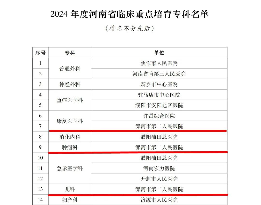 12月24日,河南省衛(wèi)生健康委下發(fā)了《關(guān)于公布2024年度河南省臨床重點(diǎn)專(zhuān)科及特色專(zhuān)科名單的通知》(豫衛(wèi)醫(yī)〔2024〕45號(hào))。市二院兒科、腫瘤科(腫瘤放療科、腫瘤內(nèi)科)、康復(fù)醫(yī)學(xué)科成功通過(guò)評(píng)審,被確定為河南省臨床重點(diǎn)培育專(zhuān)科。