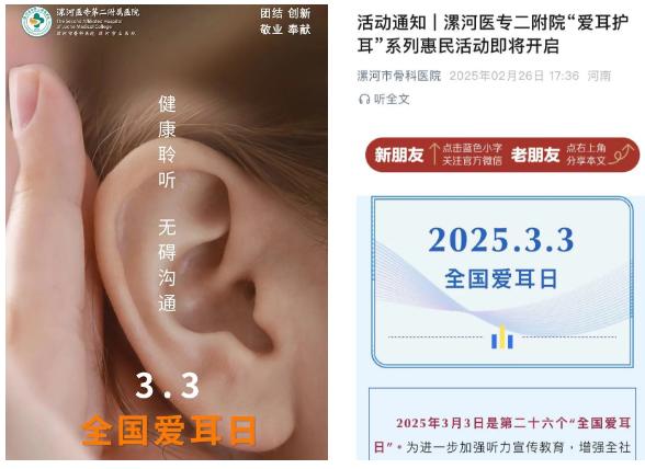 3月3日是第26個全國“愛耳日” ,為進一步普及聽力健康科學知識,增強全社會聽力殘疾預防意識和預防能力,漯河醫(yī)專二附院(漯河市骨科醫(yī)院、漯河市立醫(yī)院)耳鼻咽喉科牽頭開展了一系列內(nèi)容豐富、形式多樣的愛耳日宣傳教育活動。