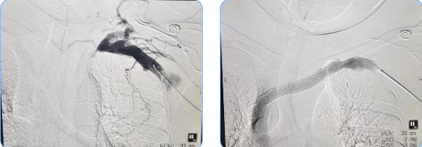 (左)術(shù)前左無名靜脈閉塞; (右)術(shù)后左無名靜脈回流通暢