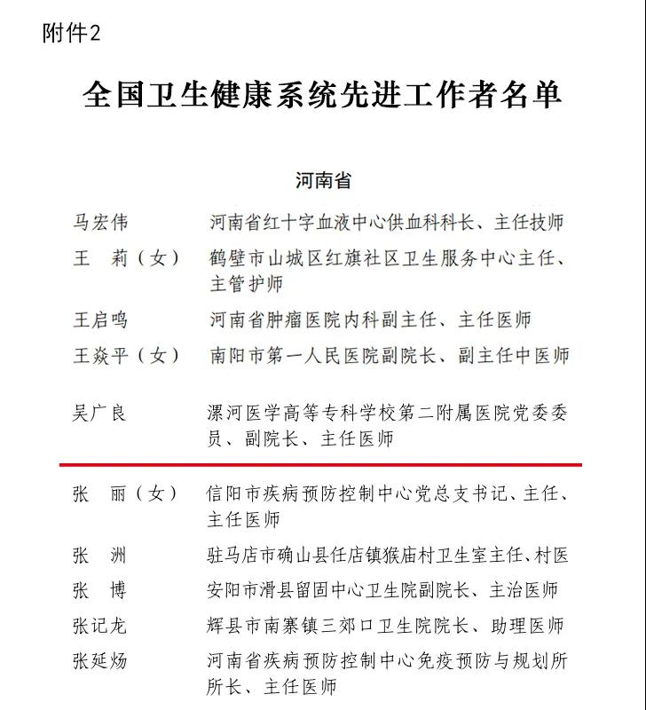 漯河醫(yī)專二附院吳廣良教授榮獲“全國衛(wèi)生健康系統(tǒng)先進工作者”稱號