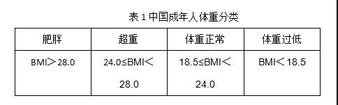 體重變化是判斷一段時期內(nèi)能量平衡與否最簡便易行的指標,也是判斷吃動是否平衡的指標。目前常用的判斷健康體重的指標是體質(zhì)指數(shù)(body massindex, BMI),它的計算方法是用體重(kg)除以身高(m)的平方。我國健康成年人(18~64歲)的BMI應在18.5~23.9 kg/m2(表1),65歲以上老年人的適宜體重和 BMI應該略高(20~26.9kg/m2)。