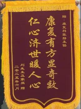 與此同時,科室還收到一面印有“康復(fù)有方顯奇效,仁心濟世暖人心”字樣的錦旗。在患病期間,患者飽受腰痛、下肢麻木等癥狀折磨,嚴重影響日常生活。來到康復(fù)科后,科室負責(zé)人張靜帶領(lǐng)科室團隊根據(jù)其病情制定個性化針灸治療方案,通過精準取穴、規(guī)范施針,配合專業(yè)康復(fù)指導(dǎo),逐步減輕患者病痛,助其恢復(fù)正常生活?;颊邽楸砀屑?,特贈錦旗,錦旗上的話語是對科室治療效果的高度認可。
