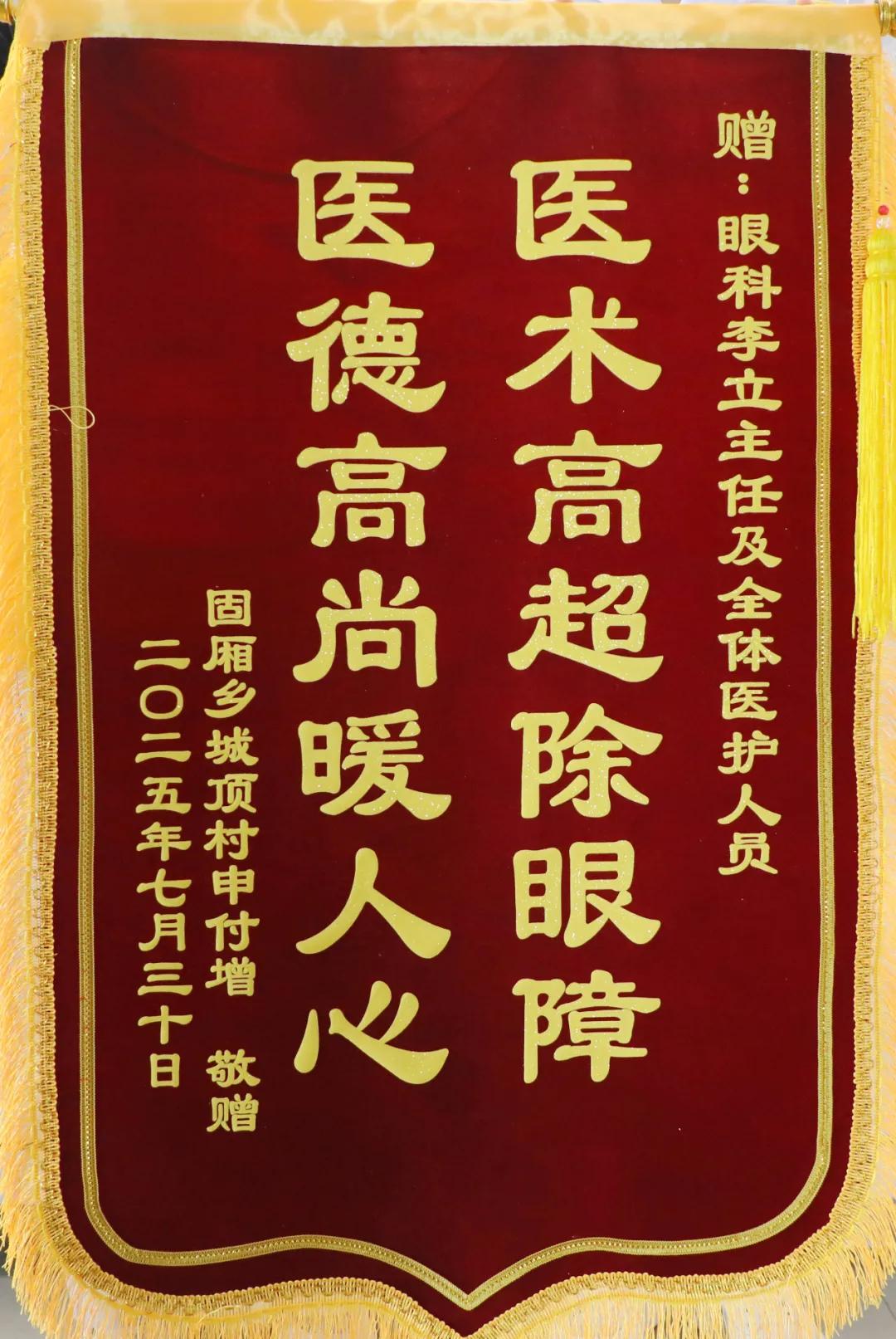 7月30日上午,臨潁縣固廂鄉(xiāng)城頂村黨支部書記楊勝武和該村申大爺家屬滿面笑容地將一面寫著“醫(yī)術(shù)高超除眼障,醫(yī)德高尚暖人心”的錦旗送到了市二院眼科病區(qū)。