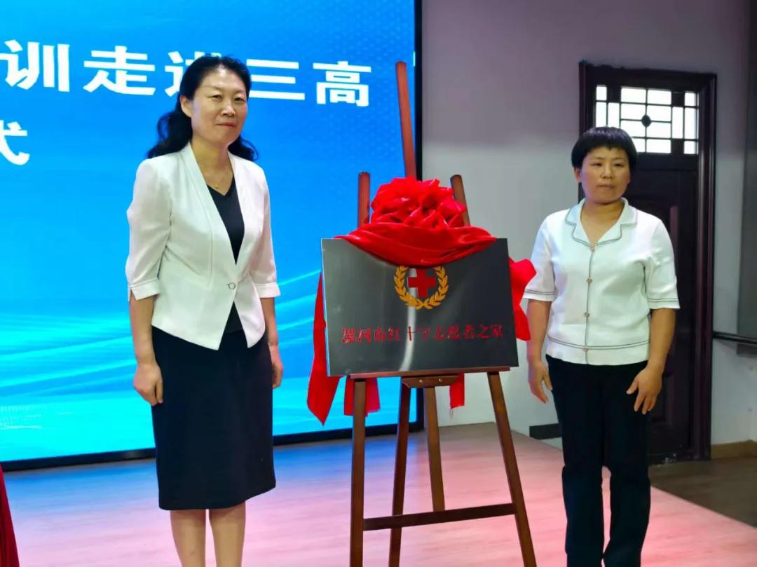 現(xiàn)場,郭俊偉向“漯河市第三高級(jí)中學(xué)紅十字應(yīng)急救護(hù)社團(tuán)”代表授旗,孫潁華和胡海英共同為“紅十字志愿者之家”揭牌。