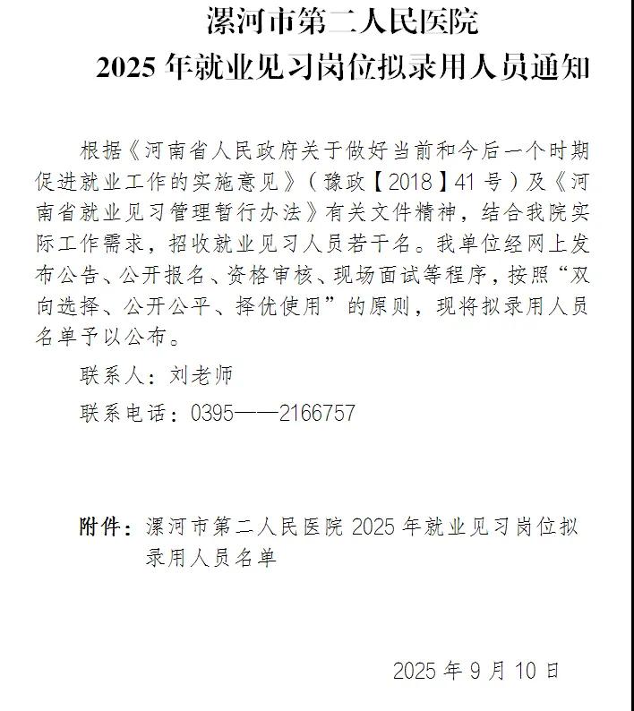 【公示】漯河市第二人民醫(yī)院2025年就業(yè)見習(xí)崗位擬錄用人員通知