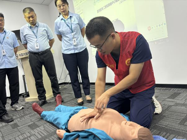 講座結(jié)束后,徐少奇醫(yī)生為大家進(jìn)行現(xiàn)場演示,拆解CPR操作的全部流程,并現(xiàn)場設(shè)置實(shí)操環(huán)節(jié),為大家進(jìn)行指導(dǎo),糾正“按壓位置錯誤”“力度不足”等常見錯誤,直至掌握正確的急救方法。演練現(xiàn)場氛圍熱烈,職工們都一一輪流進(jìn)行現(xiàn)場實(shí)際操作。