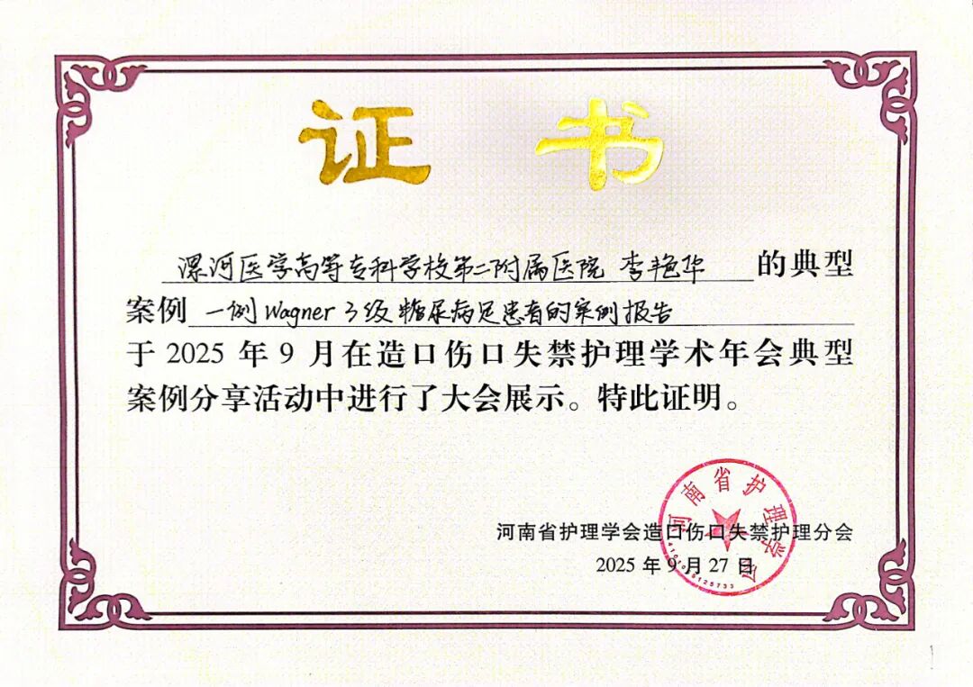 會上,漯河醫(yī)專二附院(漯河市骨科醫(yī)院、漯河市立醫(yī)院)壓力性損傷護理學組秘書、門診綜合治療室副主任護師李艷華的《一例 Wagner3級糖尿病足患者的案例報告》從全省200余例案例中脫穎而出,榮獲優(yōu)秀案例并進行現(xiàn)場展示。這是她第二次獲此殊榮,充分彰顯了醫(yī)院在??谱o理領(lǐng)域的深厚實力與學科建設(shè)的卓越成果。