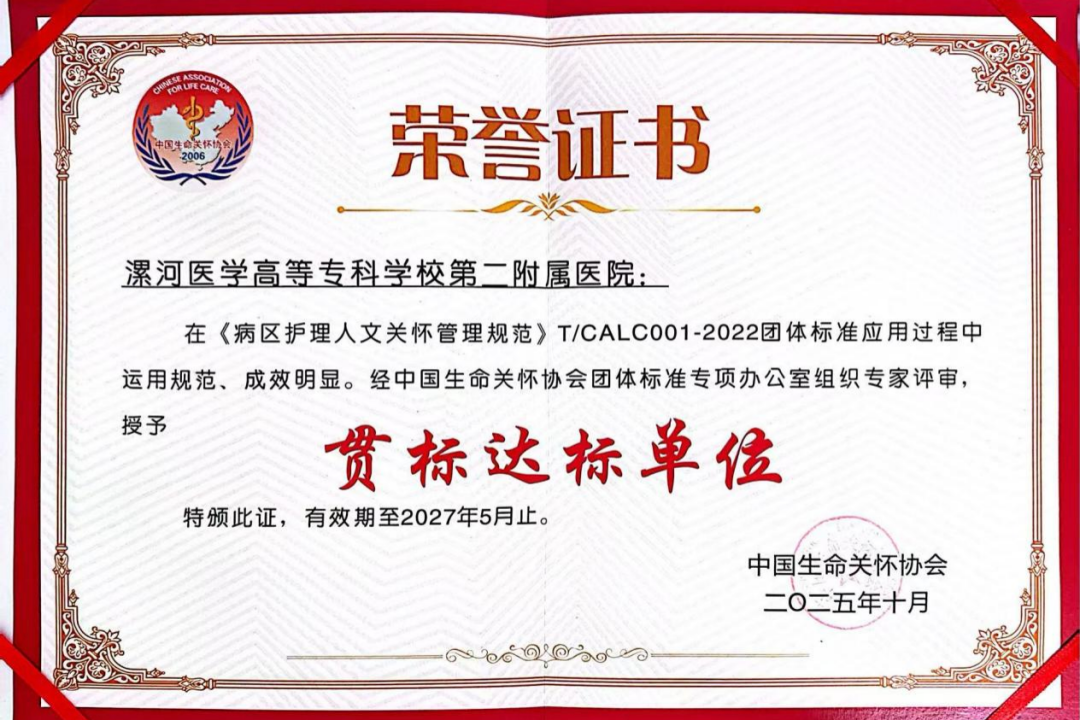 10月30日—11月2日,由國家生命關(guān)懷協(xié)會主辦、華中科技大學(xué)同濟醫(yī)學(xué)院附屬協(xié)和醫(yī)院承辦的國家級繼續(xù)教育項目“醫(yī)院護理人文關(guān)懷標(biāo)準(zhǔn)化建設(shè)”會議在武漢召開。此次大會以“關(guān)懷實踐 標(biāo)準(zhǔn)引領(lǐng)”為主題,匯聚了來自29個?。ㄊ?、自治區(qū))的護理界領(lǐng)導(dǎo)與專家,共同探討與展示醫(yī)學(xué)人文關(guān)懷標(biāo)準(zhǔn)化建設(shè)的前沿理論與實踐成果。在備受矚目的授牌儀式環(huán)節(jié),大會正式公布了《病區(qū)護理人文關(guān)懷管理規(guī)范》團體標(biāo)準(zhǔn)第二批貫標(biāo)驗收評審結(jié)果,并現(xiàn)場為達標(biāo)單位授牌、頒發(fā)證書。漯河醫(yī)專二附院(漯河市骨科醫(yī)院、漯河市立醫(yī)院)憑借在人文護理領(lǐng)域扎實的工作成效和卓越的服務(wù)水平,成功通過評審,被正式授予“《病區(qū)護理人文關(guān)懷管理規(guī)范》團體標(biāo)準(zhǔn)貫標(biāo)達標(biāo)單位”。