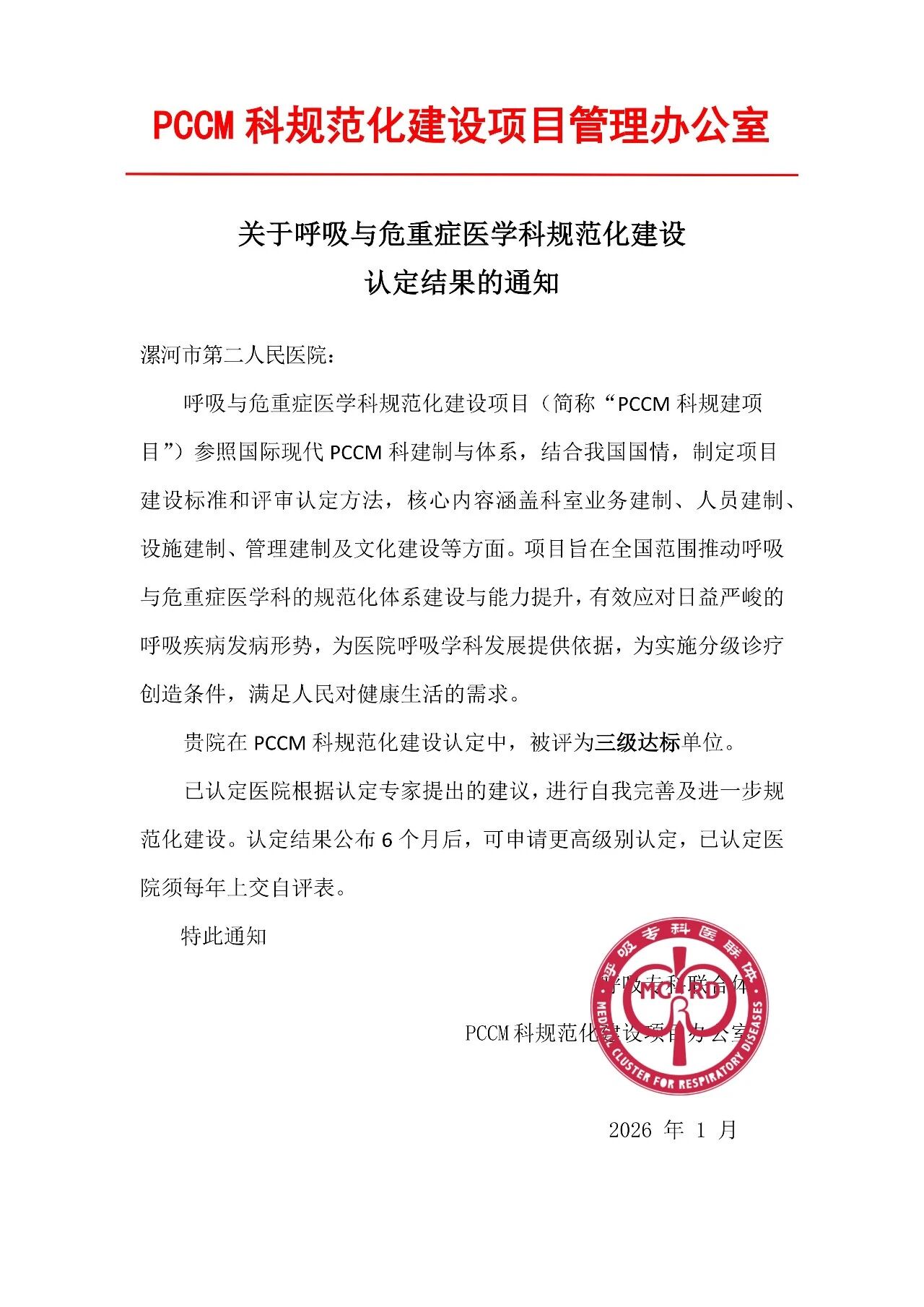 2026年1月10-11日,2026年中國呼吸學(xué)科發(fā)展大會在北京召開。會上,公布了2025年度呼吸與危重癥醫(yī)學(xué)科(PCCM)評審結(jié)果,漯河市第二人民醫(yī)院呼吸與危重癥醫(yī)學(xué)科達(dá)到三級醫(yī)院呼吸學(xué)科達(dá)標(biāo)標(biāo)準(zhǔn)。
