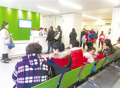 隨后記者乘坐電梯來到兒科就診樓層,全透明的玻璃墻把走廊和就診區(qū)一分為二。具有隔音效果的同時(shí),又保證了就診室內(nèi)的采光。在患者等候區(qū),不少家長抱著孩子坐在椅子上排隊(duì)等待就診,等候區(qū)內(nèi)播放著輕緩的兒童歌曲,放松了家長等待時(shí)的焦急心情。