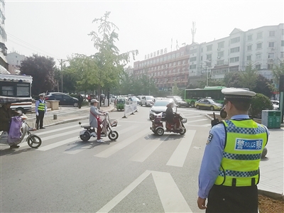 在市區(qū)大學(xué)路與嵩山路交叉口,一位輔警正在用執(zhí)法記錄儀記錄機(jī)動(dòng)車(chē)禮讓斑馬線情況。記者 楊 旭 攝