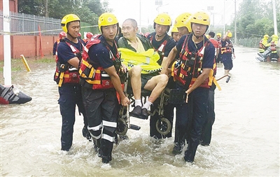 7月21日上午11時(shí)許,在安徽省六安市裕安區(qū)固鎮(zhèn)的一個(gè)衛(wèi)生院內(nèi),洪水漫過(guò)院子不斷涌進(jìn)樓內(nèi),造成大量病人被困。張洋博和隊(duì)友在三樓一個(gè)角落處搜救時(shí),發(fā)現(xiàn)一名老人癱瘓?jiān)诖?。緊急情況下,在確保老人身體無(wú)恙之后,張洋博和隊(duì)友將老人抬上輪椅,將老人轉(zhuǎn)移到安全地帶。