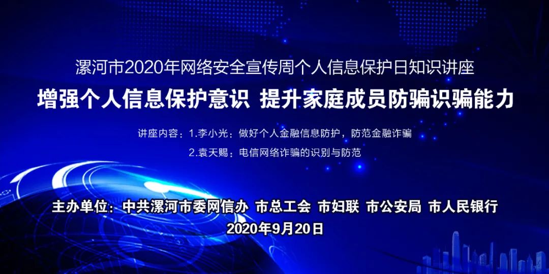 為推動漯河市網(wǎng)絡安全宣傳周個人信息保護日主題活動深入開展,結合生活中個人金融信息、電信信息容易被竊取的問題,幫助廣大家庭成員提升金融詐騙、電信網(wǎng)絡詐騙的防騙識騙能力,中共漯河市委網(wǎng)信辦、市總工會、市婦聯(lián)、市公安局、市人民銀行聯(lián)合舉辦“保護個人信息安全、提升防騙識騙能力”直播授課。