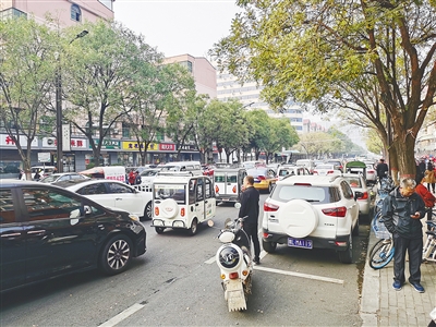 學(xué)校門(mén)前車(chē)輛亂停造成擁堵。