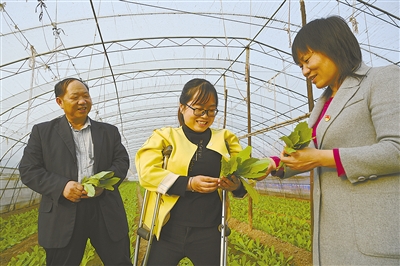 胡會(huì)玲(中)在自家大棚里看著長勢(shì)良好的蔬菜,喜悅之情溢于言表。