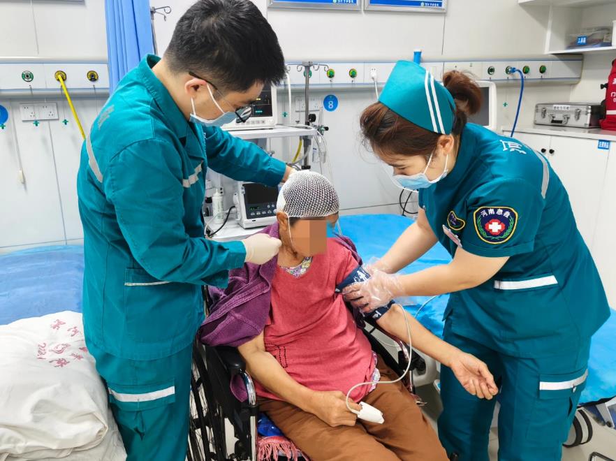 7月16日,大雨不停歇,該院急診科全天出車近20次。有的路段水深難行,醫(yī)務(wù)人員淌水到病人家中,第一時間為患者診治。在急診室內(nèi),急診醫(yī)生為外傷患者包扎傷口后詢問患者情況,護(hù)士長段銳為患者測量生命體征。