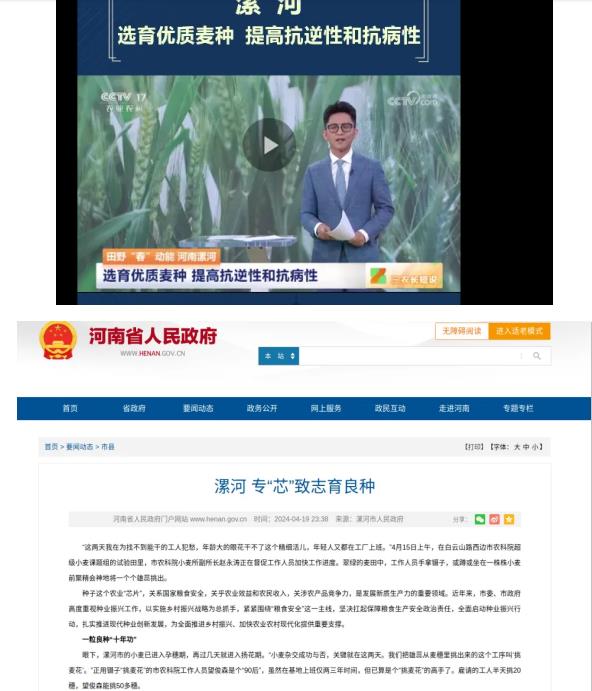 2024年,在市級以上媒體宣傳報(bào)道90余篇。《專“芯”致志育良種》被省政府官網(wǎng)報(bào)道,科技服務(wù)春耕春管工作被《河南日報(bào)》《科技日報(bào)》報(bào)道,《選育優(yōu)質(zhì)麥種提高抗逆性和抗病性》小麥新品種選育工作4月26日被央視報(bào)道。