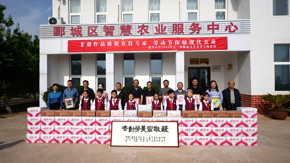 活動伊始,漯河小學學生代表王彬宇、王鈺萱、田景銳、夏華苒深情朗誦獻詞《致敬農(nóng)技專家》。隨后,少先隊員們將精心準備的剪紙、書法、繪畫等非遺作品贈予農(nóng)技專家,以表達對這些“大地追夢人”的崇高敬意。隨后,漯河市郾城區(qū)農(nóng)業(yè)農(nóng)村局黨組書記、局長張韶杰等領導及農(nóng)業(yè)科學家團隊代表登臺,接受這份滿含童真與感恩的心意,并與少先隊員們合影留念。