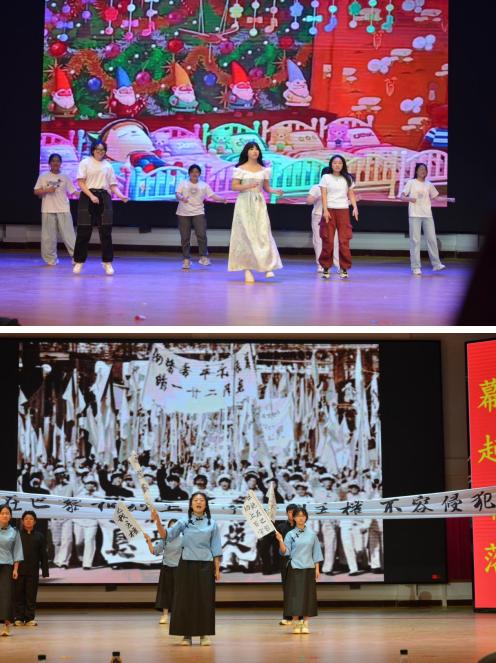 當(dāng)天演出在漯彎春韻的舞蹈中拉開(kāi)帷幕,從《寶玉大婚》《西安事變》《白雪公主和丫鬟們》《破曉》等經(jīng)典劇目的深度改編,到聚焦校園生活、社會(huì)熱點(diǎn)的劇本《再看五分鐘》《當(dāng)考試還剩15分鐘》《誰(shuí)逼瘋了周日》《回不去的十七歲》等,同學(xué)們以敏銳的觀察力捕捉生活細(xì)節(jié),用戲劇語(yǔ)言傳遞青春思考。高一(13)班的《破曉.她時(shí)代》通過(guò)講述一群率先覺(jué)醒的女大學(xué)生,沖破了舊思想的牢籠,以青春和熱血,為自由和平等而吶喊;高一(15)班高一(16)班的《文字彼岸的他們》通過(guò)時(shí)空交錯(cuò)的敘事,講述了三代女性的讀書(shū)世界,倡導(dǎo)讀書(shū)的重要性。高一(9)班的《金陵十三釵》則以極具現(xiàn)代感的舞美設(shè)計(jì)和沉浸式表演,賦予傳統(tǒng)故事新的生命力。高一(3)班高一(4)班《回不去的17歲》以兩代人的真實(shí)經(jīng)歷改編,引發(fā)學(xué)生對(duì)青春,責(zé)任和奉獻(xiàn)的思索,引發(fā)了陣陣掌聲。