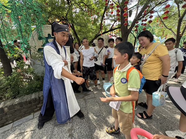 一踏入萬(wàn)歲山武俠城,古色古香的宋代街巷和建筑便映入孩子們眼簾,仿佛穿越回了千年前的大宋。街道上,鄭記肉鋪、獅子樓、王婆茶莊等實(shí)景店鋪,充滿生活氣息,孩子們好奇地打量著,想象著古人的生活場(chǎng)景。街邊藝人的精彩表演引得孩子們陣陣驚嘆,歡呼聲此起彼伏。《三打祝家莊》里,逼真的城墻、城門、大炮和烽火臺(tái),激烈的戰(zhàn)斗場(chǎng)面配合影視爆破、云梯炮戰(zhàn)、大型馬術(shù)等實(shí)景拍攝技術(shù),將《水滸傳》中的情節(jié)鮮活呈現(xiàn),孩子們看得目不轉(zhuǎn)睛,被綠林好漢們的江湖豪情深深吸引,演出結(jié)束后,掌聲雷動(dòng)。在萬(wàn)歲山武俠城內(nèi),孩子們還觀賞了多場(chǎng)精彩絕倫的演出。從《吊環(huán)》的驚險(xiǎn)特技到《大宋奇兵》的英勇無(wú)畏,再到《李逵斷案》和《林沖戰(zhàn)楊志》……此外,孩子們還進(jìn)行了一系列互動(dòng)體驗(yàn)活動(dòng)。通過石頭剪刀布、投壺等游戲來(lái)賺取銀票,換取自己喜歡的物品。每一場(chǎng)演出都讓孩子們陶醉其中,流連忘返。