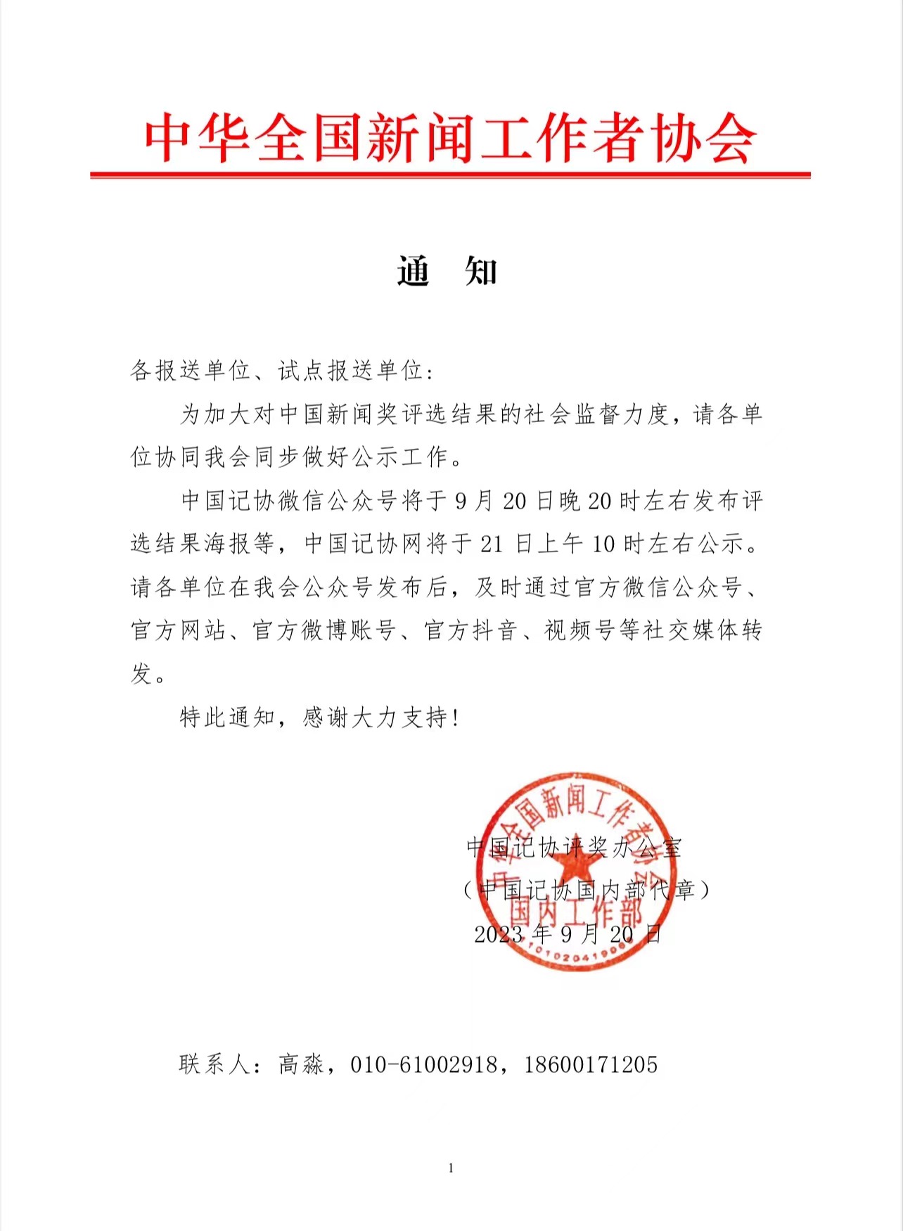 中華全國新聞工作者協(xié)會通知