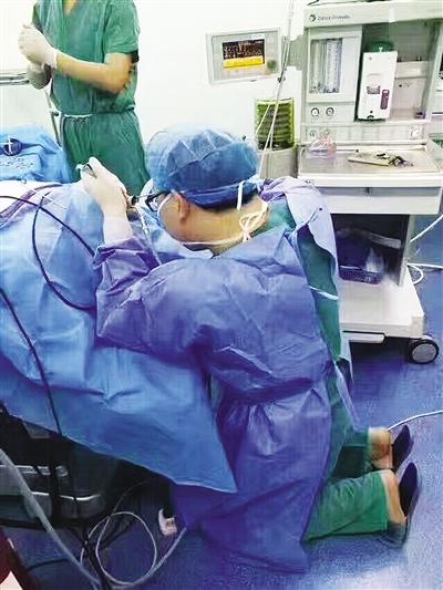 3月15日,該患者被推進手術(shù)室。因為患者聲帶有腫物,需要在支撐喉鏡下手術(shù)。“對患者進行麻醉后,為了更好地暴露手術(shù)視野,看清聲帶腫物,我只能跪在地上進行手術(shù),因為只有跪姿時手術(shù)最方便,看到的視野最清晰。”劉世鋒解釋說。