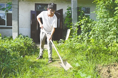 8月25日下午,記者走進舞陽縣孟寨鎮(zhèn)龍東村王帥斌的家中。院內有一條通向堂屋的碎磚路,其他地方種了些蔬菜,剩余地方都是荒草。三間房屋經過危房改造,房頂加固了彩鋼瓦。18歲的王帥斌正手握鐵鍬,鏟除小路上的雜草。