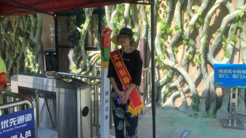 神州鳥園景區(qū)在入口安排文明引導(dǎo)員引導(dǎo)游客文明出游