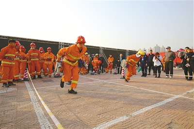 消防員技能比武競賽。本報記者 朱 紅 攝