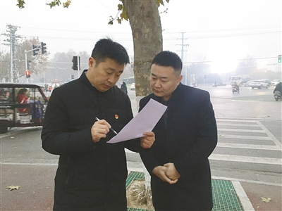 孟海銀(左)和同事研究道路交叉口渠化改造。
