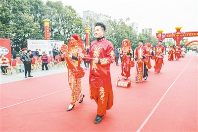 當(dāng)天上午10時(shí)許,在婚禮現(xiàn)場,端莊秀麗的新娘們等待著意中人;新郎們?yōu)t灑大方,期待抱得美人歸。吉時(shí)已到,中式婚禮開始,先是傳統(tǒng)的大鼓、舞獅表演,接著是新娘入場、新婿登場,然后是迎新娘、入華堂、拜天地、交換定情信物、夫妻對拜、合影等活動(dòng)流程。