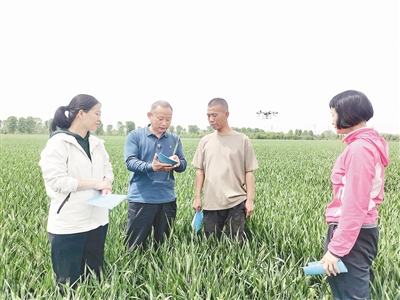 李世民(左二)向趙惠杰(右二)講解小麥病蟲(chóng)害防治要點(diǎn)。