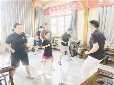 目前正值暑假,知育學(xué)堂內(nèi)的青少年中醫(yī)夏令營(yíng)活動(dòng)正在進(jìn)行中。記者在夏令營(yíng)的活動(dòng)教室看到,十幾個(gè)孩子跟著老師練習(xí)八段錦。參加夏令營(yíng)的孩子們來(lái)自天津、河北、鄭州等。“我媽媽從河北開(kāi)車(chē)把我送到這里,主要是為了培養(yǎng)我對(duì)中醫(yī)的興趣,讓我了解如何調(diào)理自己的身體。”今年12歲的陳榮告訴記者。