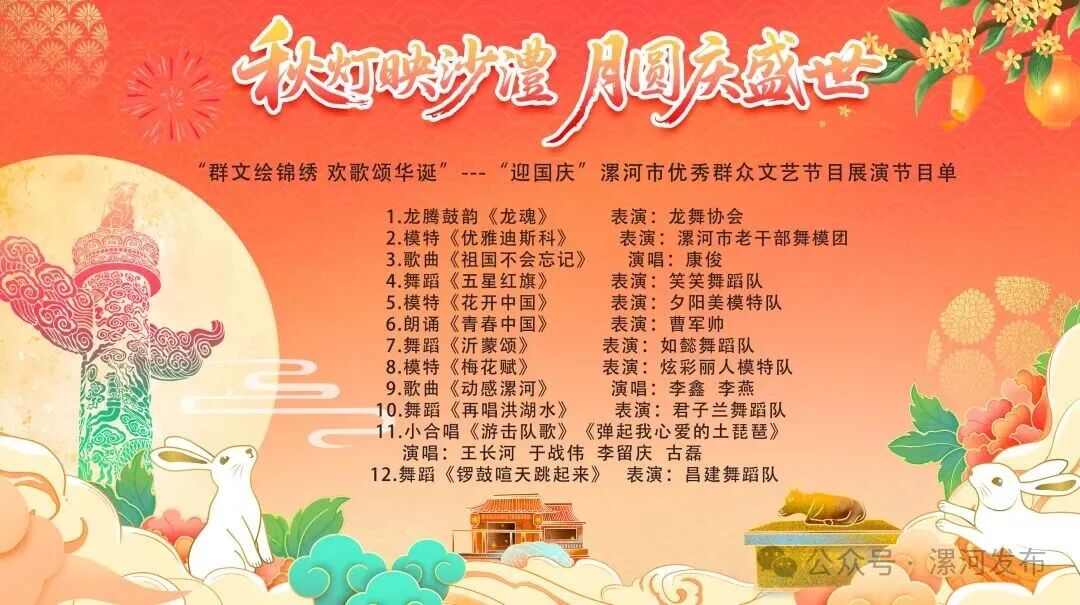 今天19:30,沙澧河風(fēng)景區(qū)紅楓廣場,“群文繪錦繡 歡歌頌華誕”——漯河市迎國慶優(yōu)秀群眾文藝節(jié)目展演,精彩繼續(xù)!
